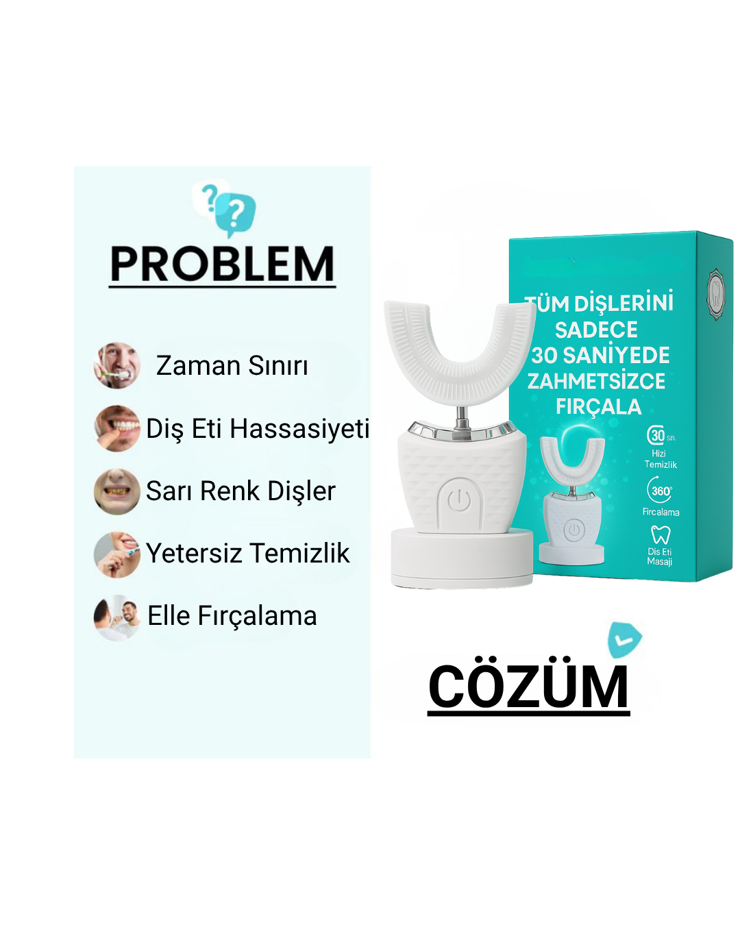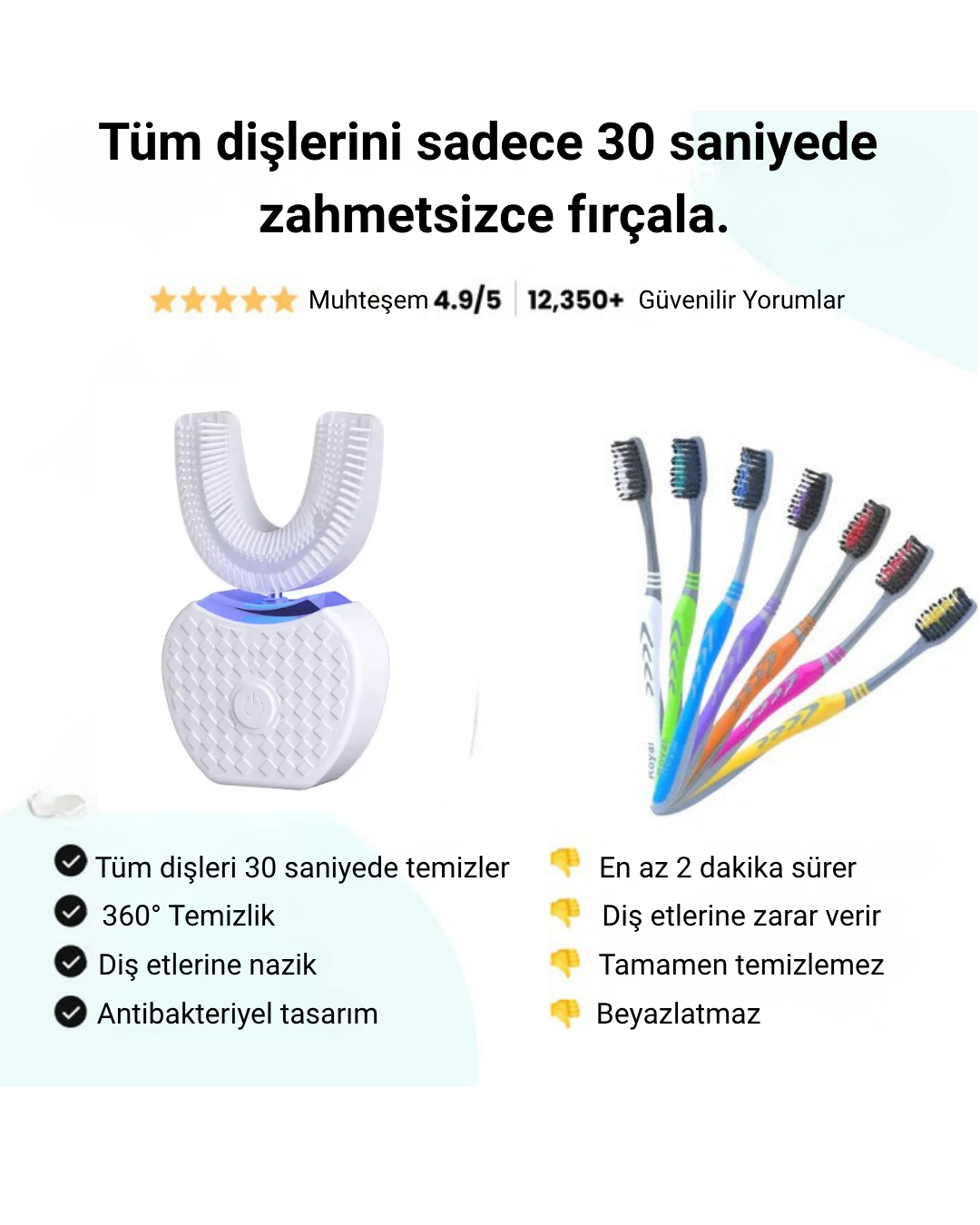 Dişlerinizi sadece 30 saniyede etkili bir şekilde temizleyin! Kablosuz, taşınabilir ve şarj edilebilir U-şekilli diş fırçası ile plak ve bakterilere veda edin.