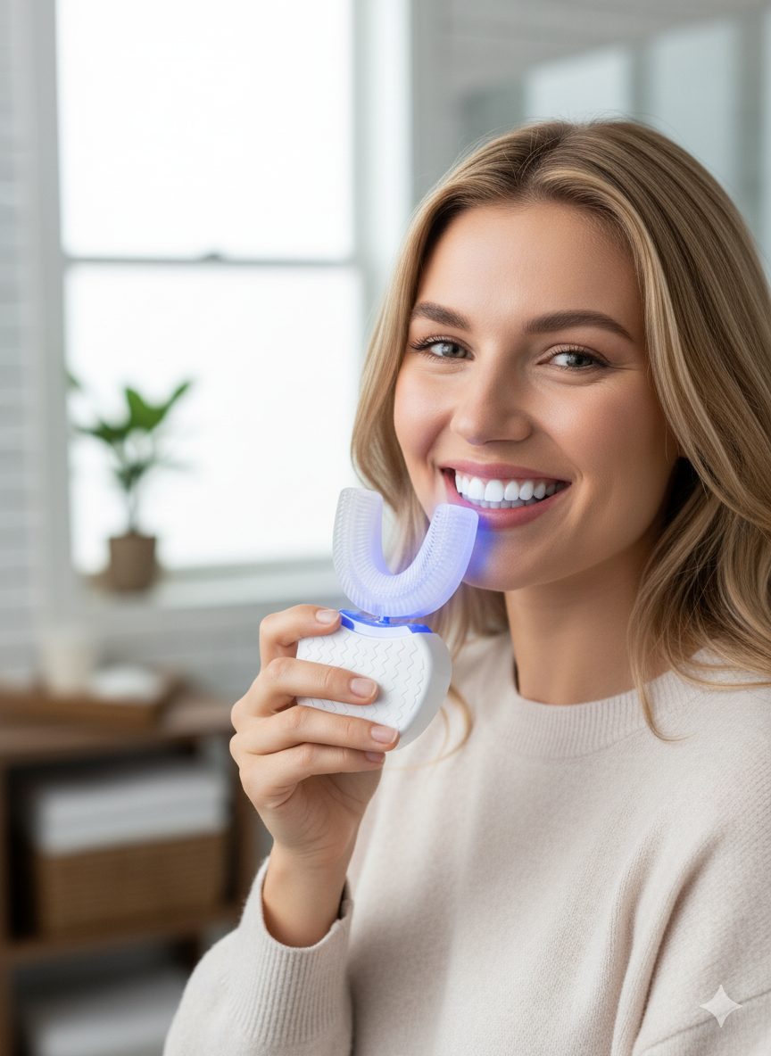 Yüksek performanslı diş beyazlatma cihazınızla tanışın. Sadece birkaç dakika içinde, bembeyaz dişlere ve ışıl ışıl bir gülümsemeye sahip olun. Kolay, hızlı ve ev konforunda.
